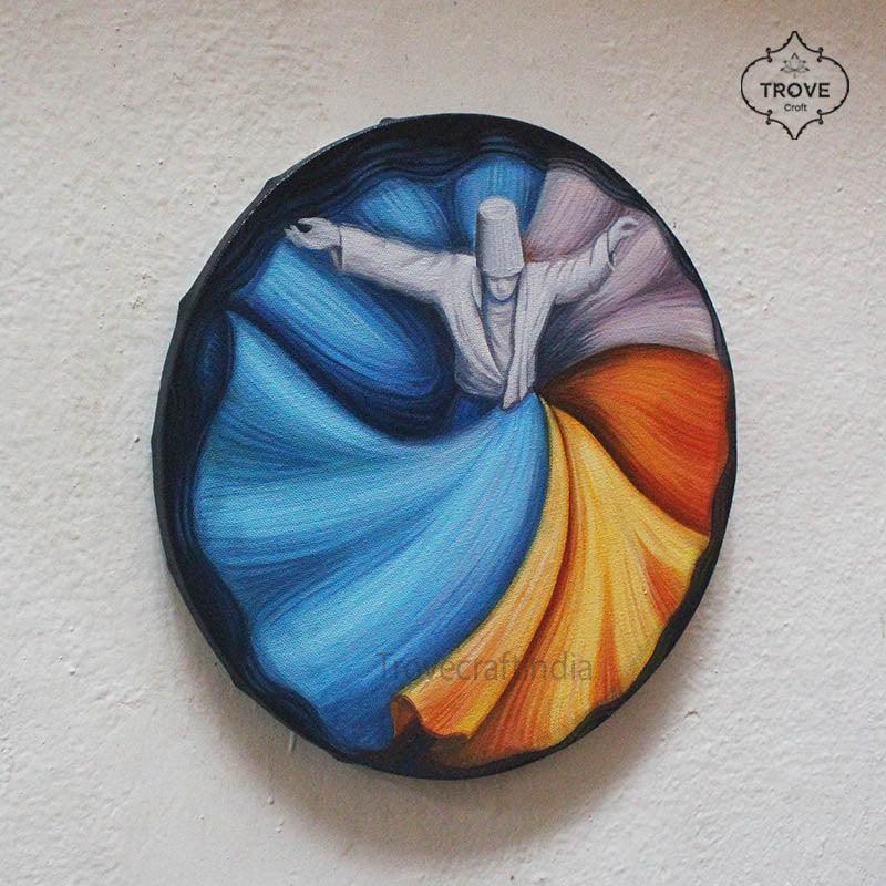 This is hand-painted on round canvas by our contemporary artist. This motif is inspired from Sufi whirling which is a form of physically active meditation, which is still practiced by Sufi dervishes. Makes a great addition for wall décor.