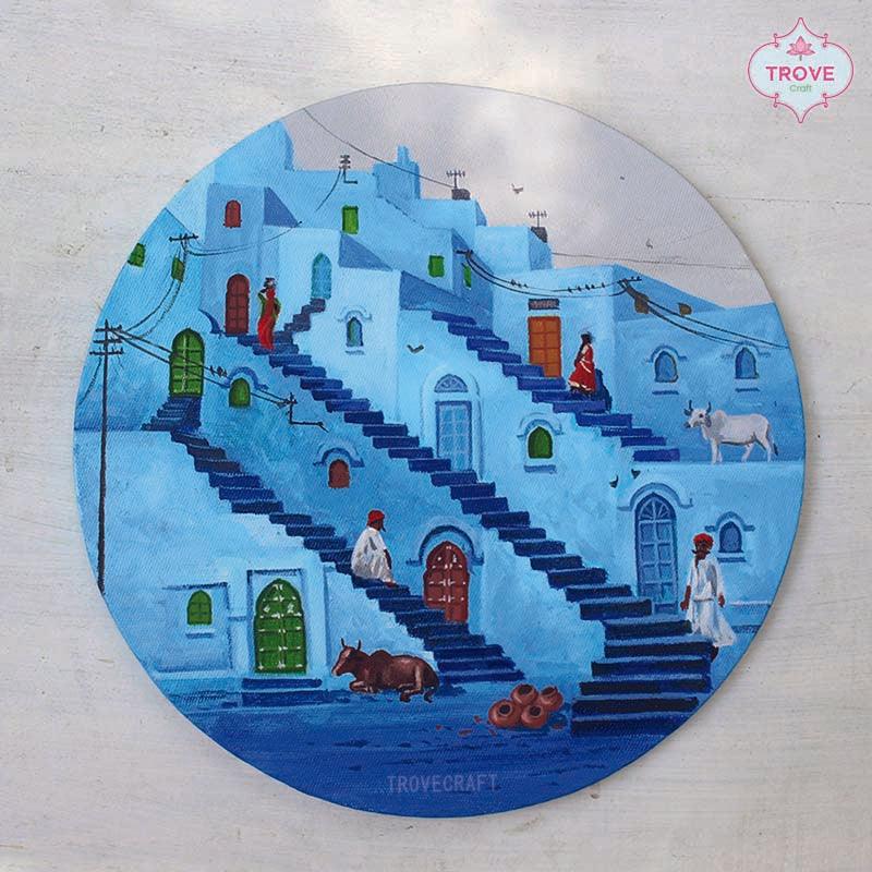 An original composition hand-painted in acrylic medium of the Jodhpur city! also known as the Blue City, involves capturing its unique architectural and cultural essence by our contemporary artist.