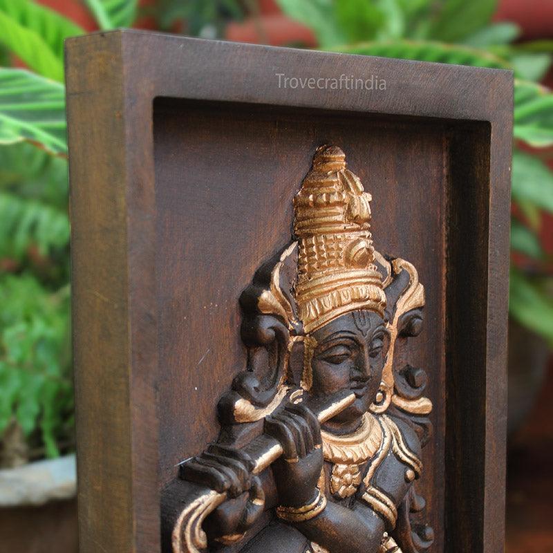 This Krishna Panel is hand carved by artists from Tamil Nadu. And then painted on by our in house artist.