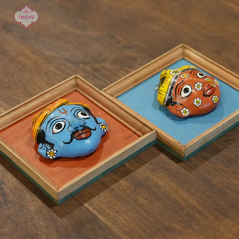This decorative Cheriyal wall masks are made using the cherial style's ancient mask making technique, which consists of an elaborate five-step process involving moulding, drying, decorating, smoothing and, finally, painting in the distinctive bright Cheriyal colours.