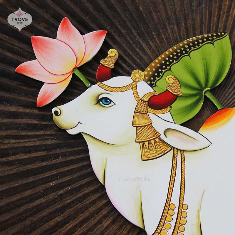 MDF cutout of white cow facing left, hand-painted with gold work on ornaments in pichwai style. Use them individually or together.