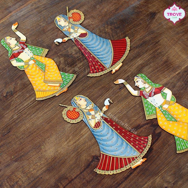 A set of two MDF cutouts of Gopika, hand-painted with pichwai style, and facing in either direction. Use them individually or together.