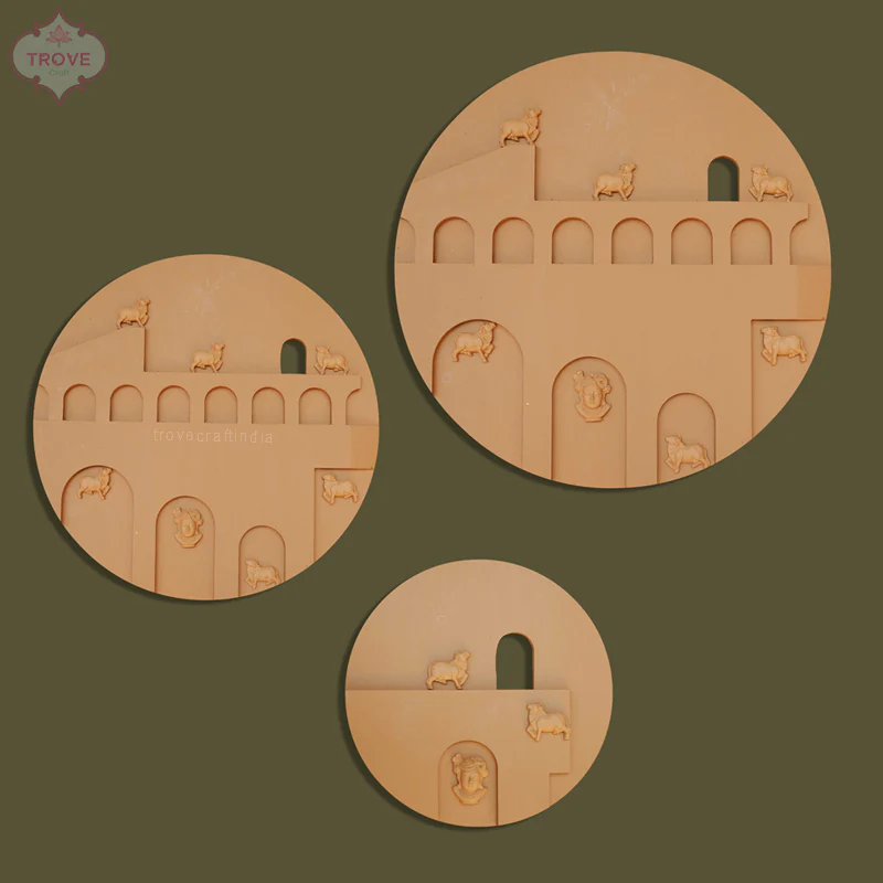 Set of 3 - Contemporary Mixed Media Pichwai Wall Plaques, using terracota motifs of cows and srinathji - on architectural themed CNC cut plaques makes for an unsual contemporary decor accent.