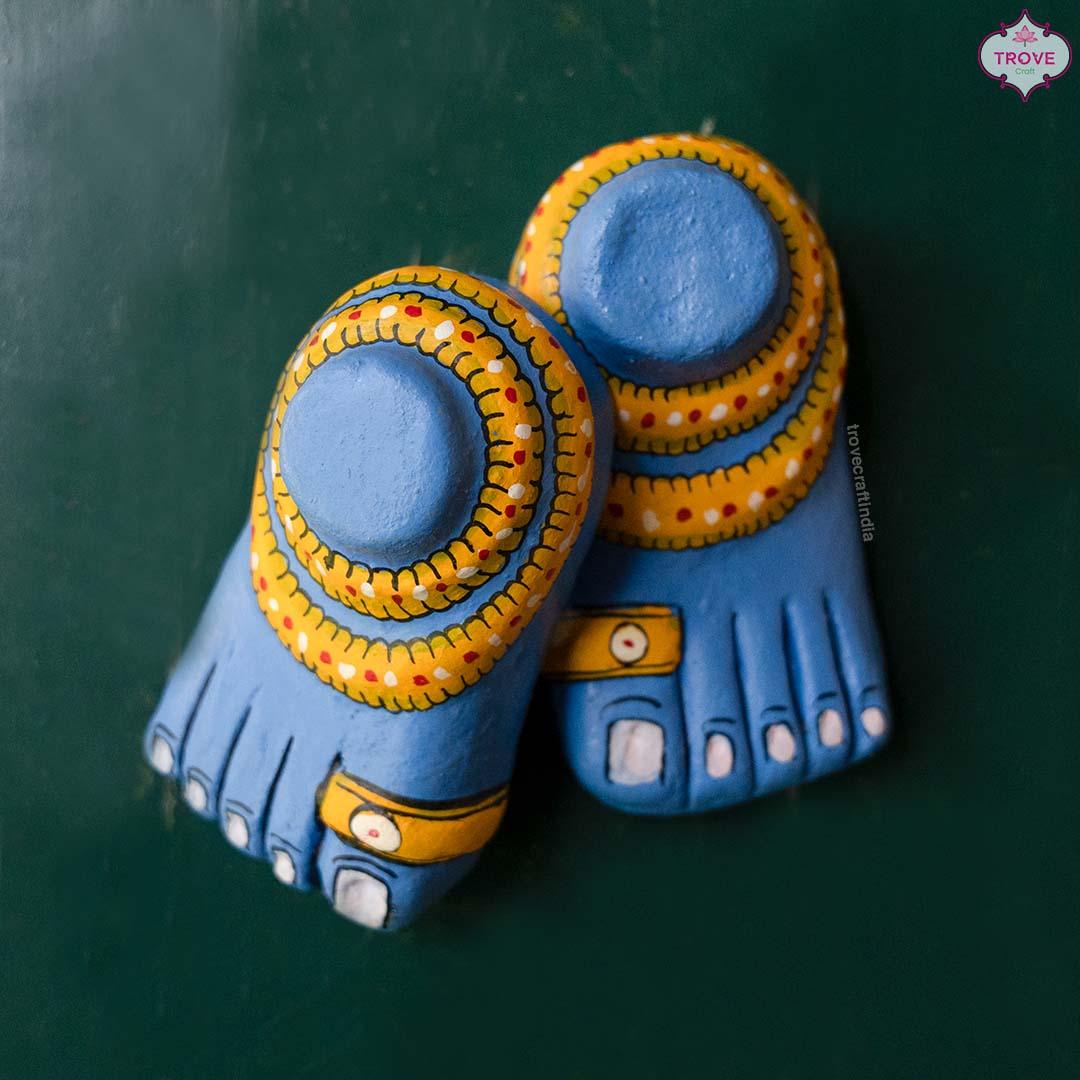 This decorative Cherial Feet set are made using the cherial style's ancient mask making technique, which consists of an elaborate five-step process involving moulding, drying, decorating, smoothing and, finally, painting in the distinctive bright Cheriyal colours.